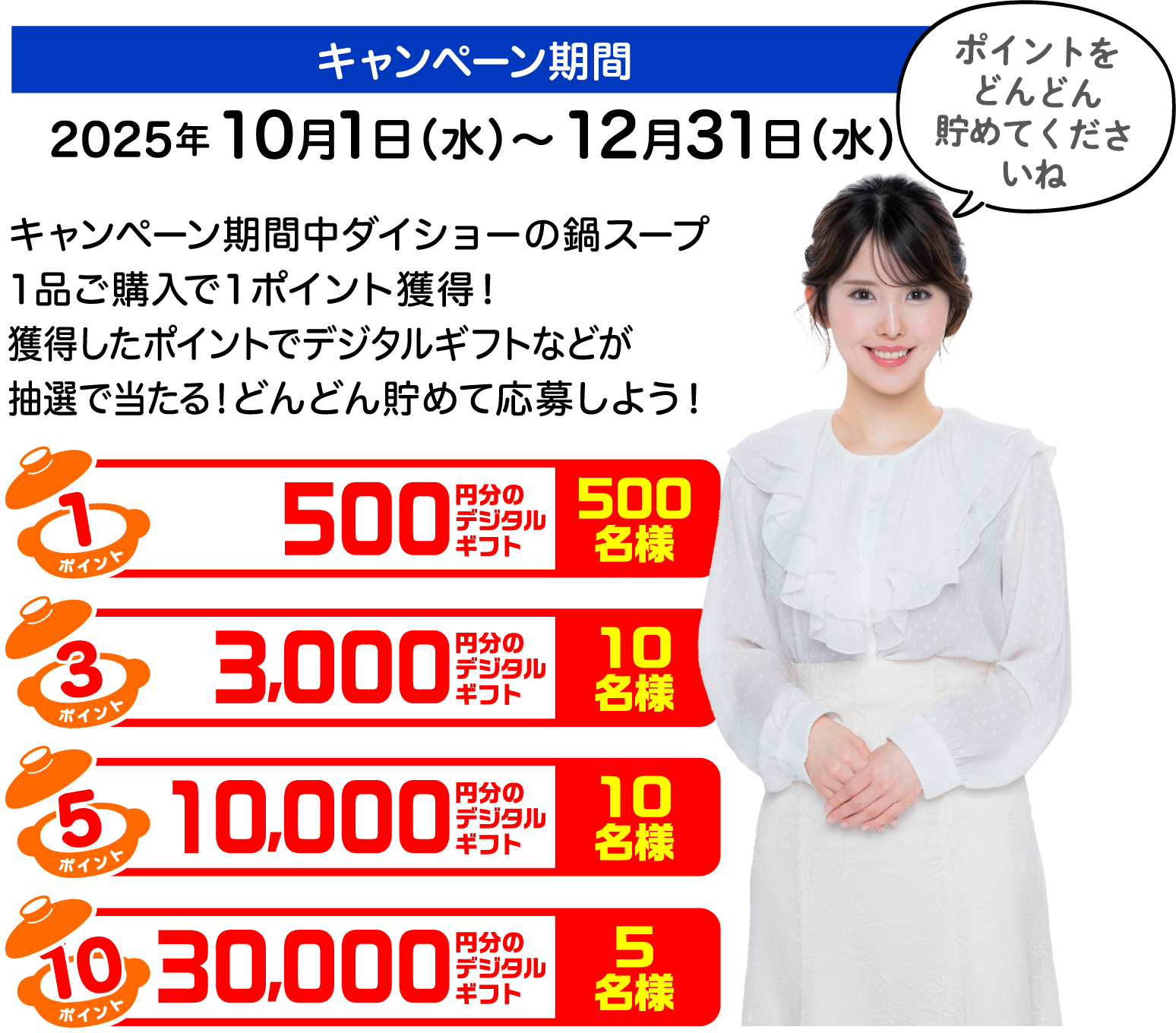 - ダイショーのマークの入っている鍋スープをご購入のレシートをアップロードしてください。1品につき1ポイント貯めることができます。